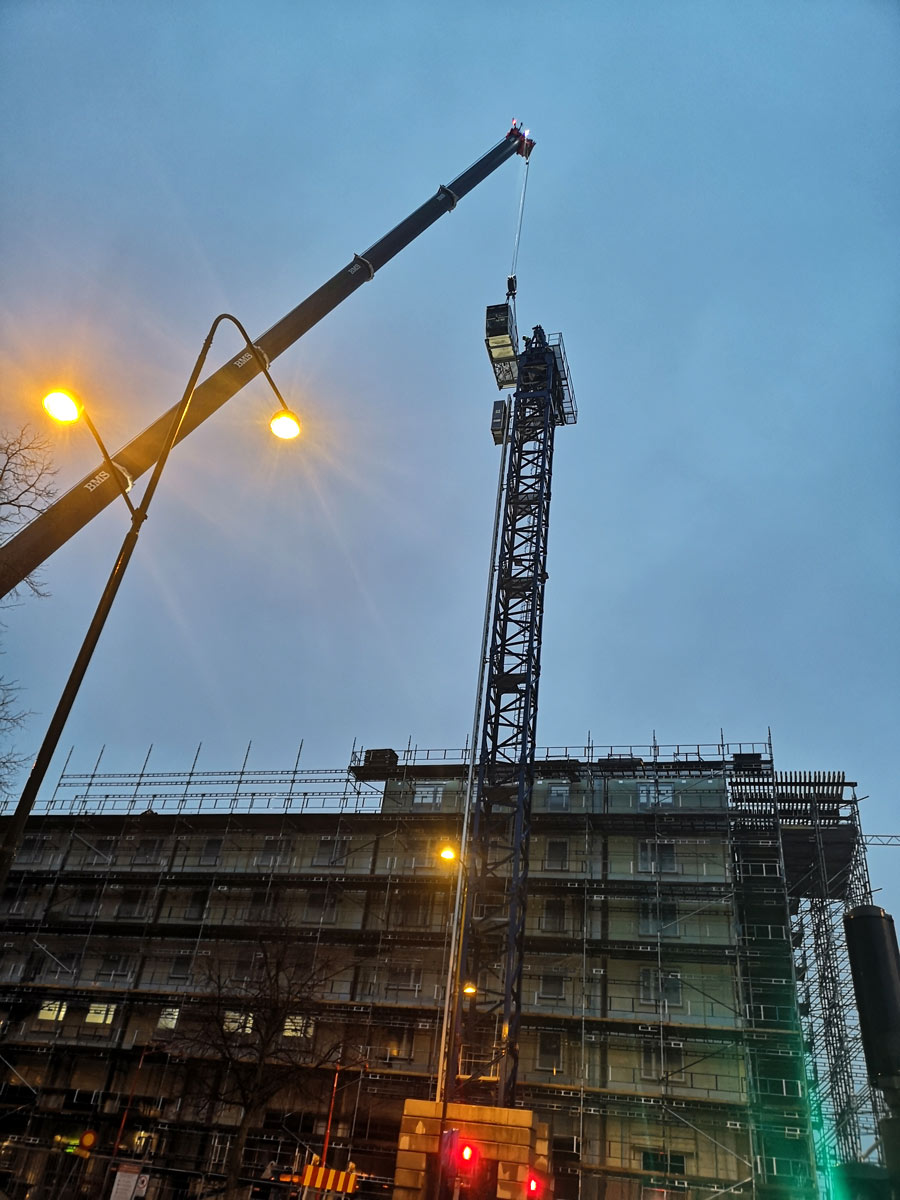 I början av projektet var den monterad i centrum av arbetsplatsen, detta på grund av tunga lyft till huskropparna. I början av december så flyttades kranen ut till utsidan av huskroppen. Med ovärderlig hjälp från en 450 tons mobilkran med 85 m arm från BMS klarade våra krantekniker av kranflytten på 2–3 dagar. Här ser ni ögonblicksbilder över arbetet + en bild från Google Maps som visar hur tomten såg ut när grunden förbereddes.