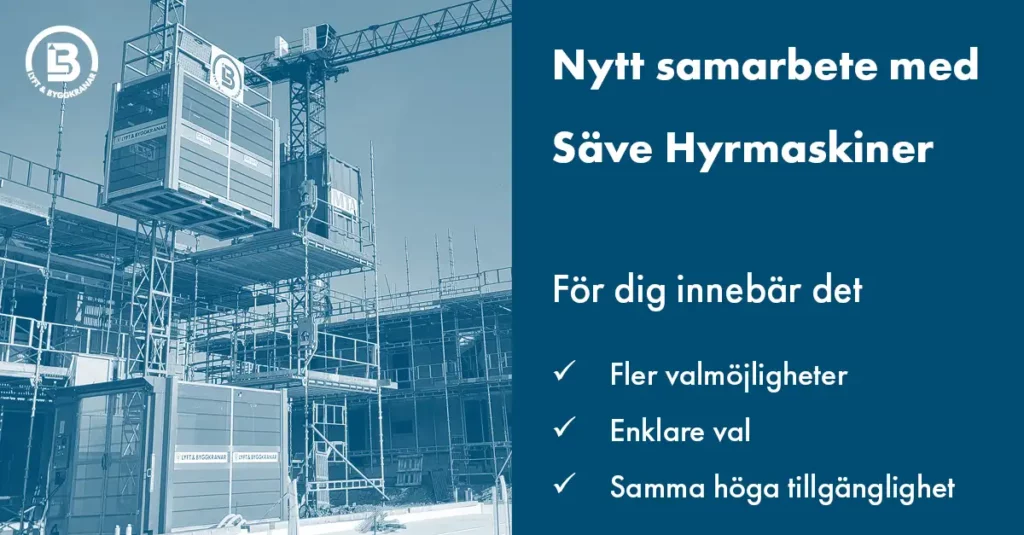 Vi på Lyft & Byggkranar AB har inlett ett samarbete med Säve Hyrmaskiner inom hissuthyrning.