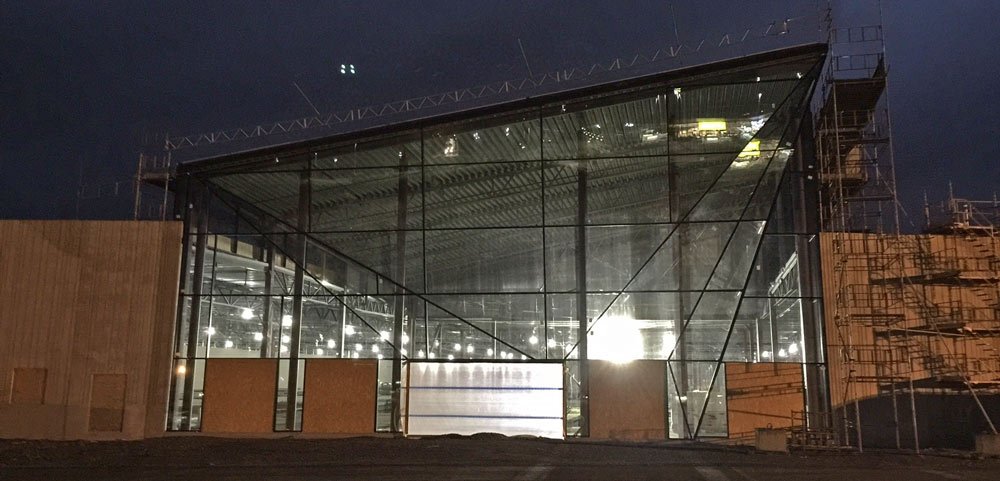 På C4 Shopping i Kristianstad hjälper vi till efter bästa förmåga med bl.a. uppvärmning och belysning för vintersäkring. I det största huset arbetas det just nu för fullt med innerväggar och installation av el, ventilation och sprinklersystem. Huset är på 40 000 kvm så det är mycket yta att täcka och värma upp. Till uppvärmningen tar vi hjälp av en undercentral kopplad till fjärrvärmenätet och två mobila panncentraler. Till dessa har vi anslutit sex stycken luftvärmare Elbjörn TF 250HWI på vardera 250 kW samt ett antal mindre luftvärmare.